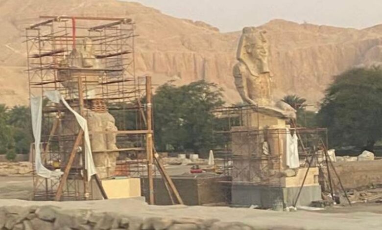 قبل لحظة الكشف الكبرى غدًا.. آخر صورة لتمثالي الملك أمنحتب الثالث في معبده بالأقصر
