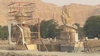 قبل لحظة الكشف الكبرى غدًا.. آخر صورة لتمثالي الملك أمنحتب الثالث في معبده بالأقصر